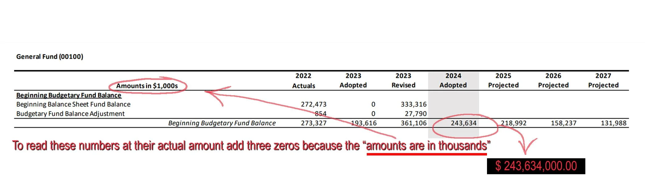 Looking at a budget, one will often see a descriptor that reads something like, “numbers in thousands (1,000s)” or “numbers in millions” or something to that effect. This can sometimes be quite confusing if we are not accustomed to looking at budgets and spreadsheets, even though it can arguably make things easier for those who are.