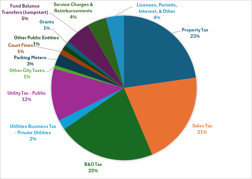 The Seattle City government has four main sources of revenue supporting the services and programs the City provides its residents: